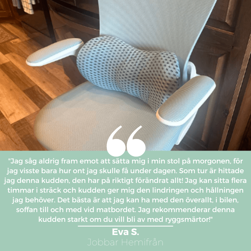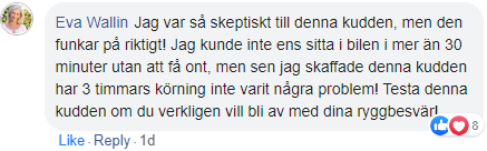 "Min mamma hade ofta väldigt ont i ryggen i sin stol och då såg jag denna annonsen. Hon var lite tveksam i början, men hon säger att det är en av de bästa lösningar hon någonsin har testat. Hon kan sitta utan besvär och det lindrar på riktigt hennes smärta!"