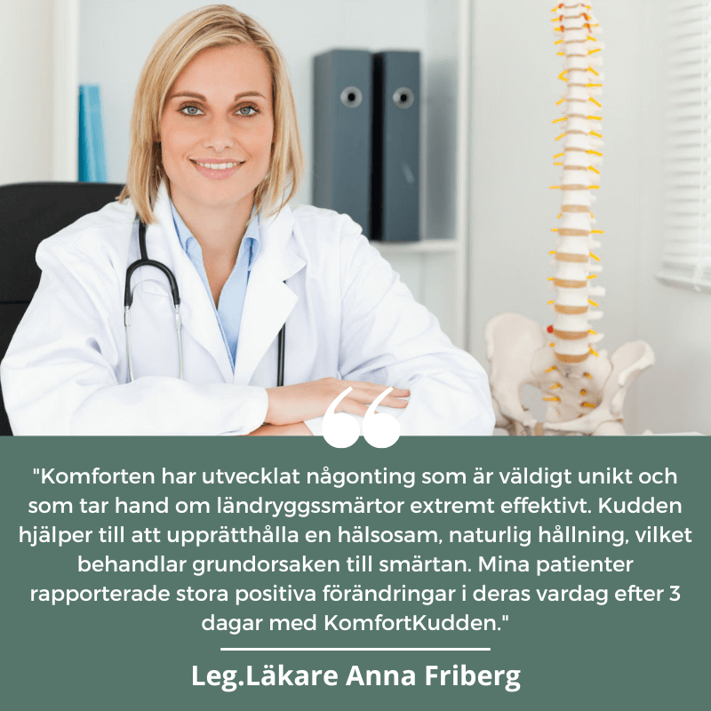 "Komforten har utvecklat någonting som är väldig unikt och som tar hand om ländryggssmärtor extremt effektivt. Kudden hjälper till att upprätthålla en hälsosam, naturlig hållning, vilket behandlar grundorsaken till smärtan. Mina patienter rapporterade stora positiva förändringar i deras vardag efter 3 dagar med KomfortKudden."